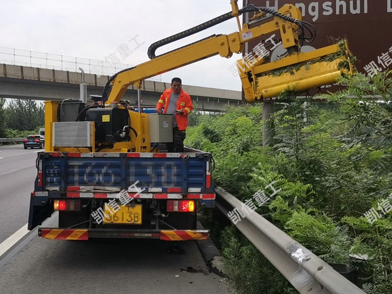 紫穗槐修剪機適用于公路兩側路肩綠植雜草修剪作業。在公路路肩的綠植雜草中,紫穗槐耐候性好,成長較為旺盛,莖枝較硬,一般修剪機械很難完畢,只能靠人工運用小型機具完畢修剪作業。人工小型機具修剪存在著修剪不平坦、工人勞動強度、大作業功率低一級問題。因而山東凱信重工機械有限公司開發一種適用于公路路肩兩頭紫穗槐修剪作業的設備來處理上述技術問題。